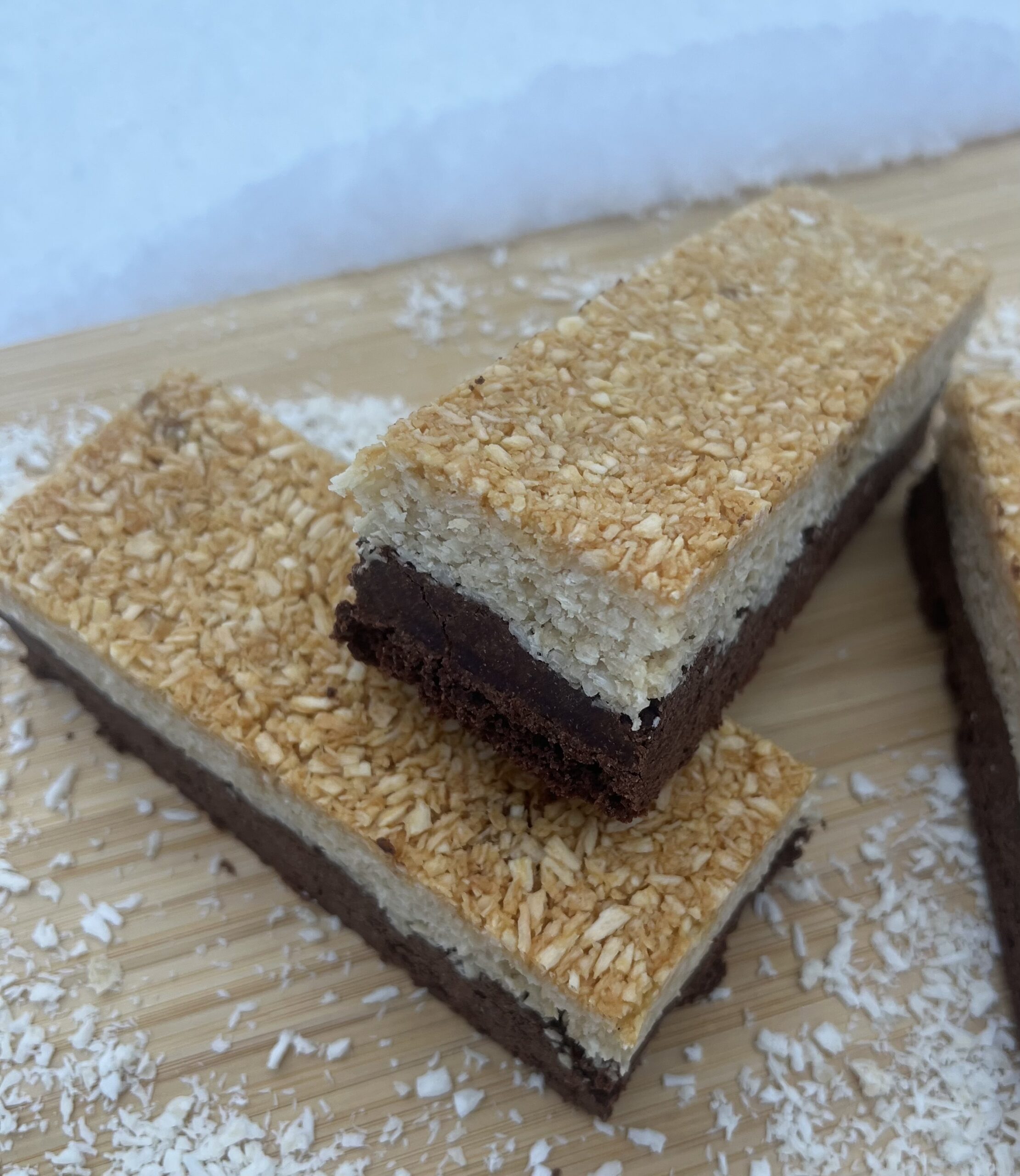 Coconut Macaroon Protein Bar : Cookie or Protein Bar? Both! Enjoy health in treat form. Chocolate shortbread protein cookie topped with a chewy coconut macaroon topping. Wheatless and wrapped in a compostable wrapper