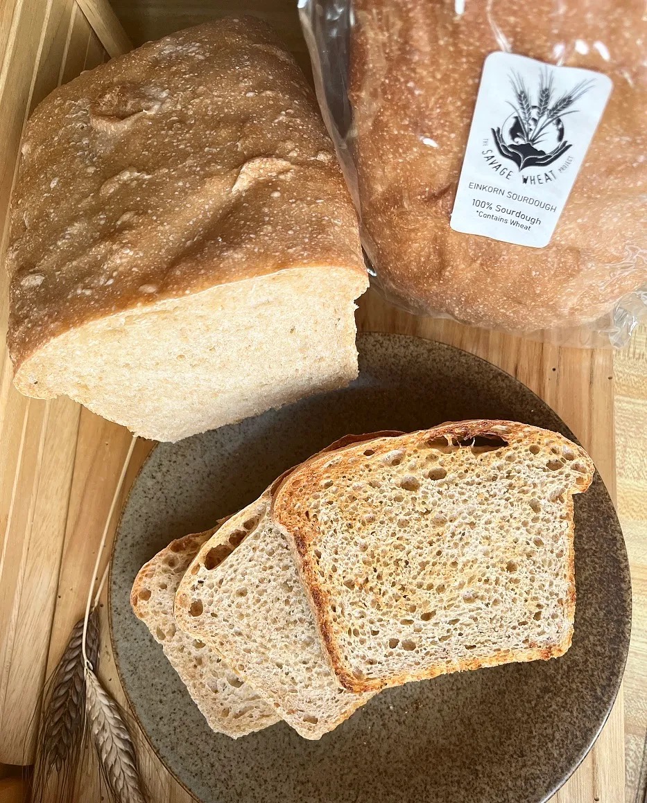 Ingredients: Water, Organic Sourdough culture, Organic Bread Flour, Whole Organic Einkorn Flour, Sea Salt. Pans greased with coconut oil.
